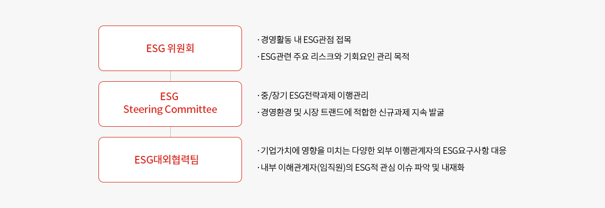 또한 2022년 상반기 수립한 중ㆍ장기 ESG전략과제 이행관리 및 신규과제 지속발굴 목적의 ESG Steering Committee를 구성하여 운영 중에 있습니다.